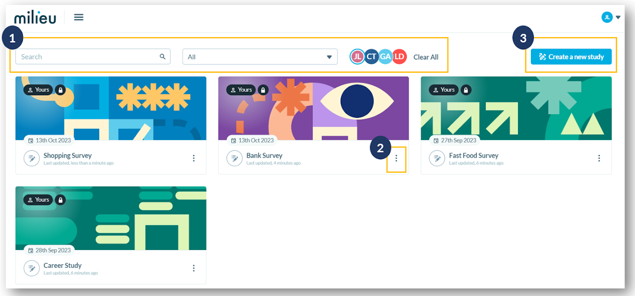 Access a study by clicking on ‘Create a new survey’ from the main page or the Studio page from the main menu.