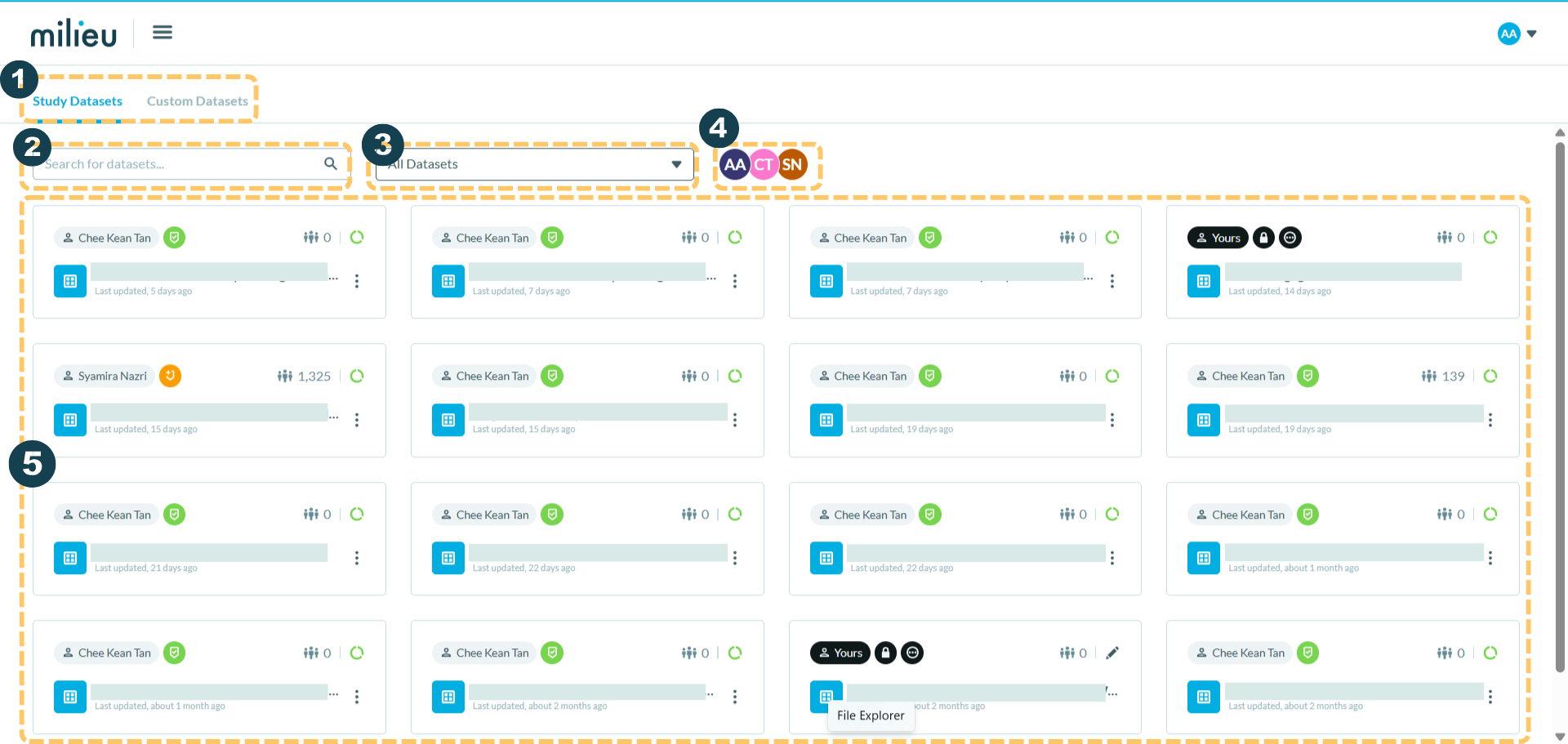 1. Choose between Study Datasets and Custom Datasets view. (Note: Study Datasets is the default view)