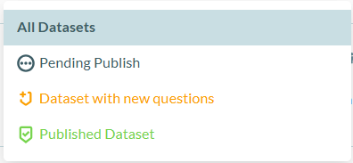 3. Filter by status of the dataset - Pending Publish, Dataset with new questions, Published Dataset. These statuses came with their own unique icon which can be viewed in each study summary: