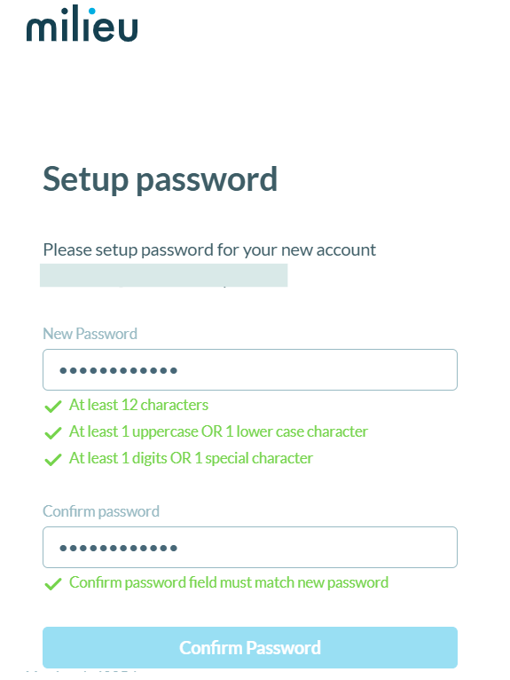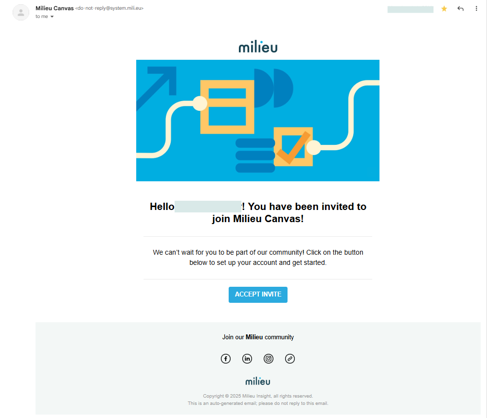 - Once confirmed to have an account created, you will receive an email invite from Milieu.